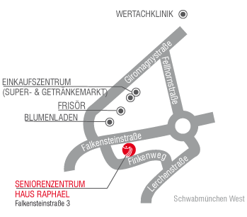 Ein neues Zuhause für SeniorenIm Alter und auch bei Krankheit und Pflegebedürftigkeit in den vertrauten vier Wänden zu bleiben und dort versorgt zu werden – das wünschen sich die meisten Menschen. Die ambulante Pflege durch die Sozialstation macht dies für viele ältere Mitbürger möglich. Aber häusliche Betreuung hat auch ihre Grenzen: bei fortgeschrittener Demenz, Schwerstpflegebedürftigkeit oder wenn keine Familienangehörigen an der Versorgung mitwirken können. In diesen Fällen braucht es ein Pflegeheim, in das man sich nicht abgeschoben fühlt. Im Seniorenzentrum Haus Raphael finden alte und kranke Menschen ein neues Zuhause in familiärer Atmosphäre. Unsere 2009 eröffnete Einrichtung an der Falkensteinstraße bietet Platz für 34 Bewohner – dauerhaft oder in Kurzzeitpflege. Neben einer ganzheitlichen und individuellen pflegerischen Betreuung legen wir im Haus Raphael auch auf die umfassende soziale Betreuung großen Wert. In kirchlicher TrägerschaftDas Seniorenzentrum Haus Raphael ist eine kirchliche Einrichtung in Trägerschaft des Caritasverbands Schwabmünchen und Umgebung e.V. und des Diakonievereins Schwabmünchen und Umgebung e.V. Das spiegelt sich in unserem Leitbild wieder. Zugleich gilt: Jeder Bewohner unabhängig von seinem Verhältnis zu Religion und Kirche ist willkommen. Im Westen Schwabmünchens gelegenDas Haus Raphael ist an der Falkensteinstraße 3 im Westen Schwabmünchens ruhig gelegen und bietet gleichzeitig eine gute Infrastruktur (Einkaufsmöglichkeiten, Physiotherapie-Praxis, Medizinische Fußpflege/Podologie, Friseur usw. in nächster Umgebung).