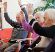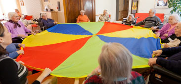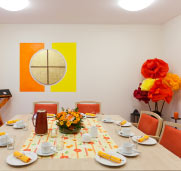 Im Erdgeschoss ist zusätzlich auch ein Multifunktionsraum vorhanden, der für kleine Feiern, aber auch als Andachtsraum für religiöse Veranstaltungen genutzt wird. Im Obergeschoss ist im Therapieraum Platz für Sitzgymnastik, Basteln und Spielen. In beiden Stockwerken gibt es Pflegebäder, behindertengerechte WCs und Pflegestützpunkte, dazu weitere Funktionsräume für Pflege und Hauswirtschaft. Die Flure sind im Karree angeordnet und bieten gerade demenzkranken Bewohnern die nötigen Bewegungsmöglichkeiten.