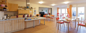 Unser zweistöckiges Gebäude ist in zwei überschaubare Pflegewohngruppen mit 17 Bewohnern aufgeteilt. Mittelpunkt jedes Stockwerks ist eine große, gemütlich gestaltete und komplett ausgestattete Wohnküche als Gemeinschaftsraum mit verschiedenen Sitzmöglichkeiten, z.B. zum Essen oder Ausruhen. Der Gemeinschaftsbereich geht in das Foyer am Lichthof mit kleinen Sitzgruppen über, die Möglichkeit zum Aufenthalt und zur Begegnung bieten. Terrasse, Balkon und Lichthof bieten weitere Sitzplätze im Freien.